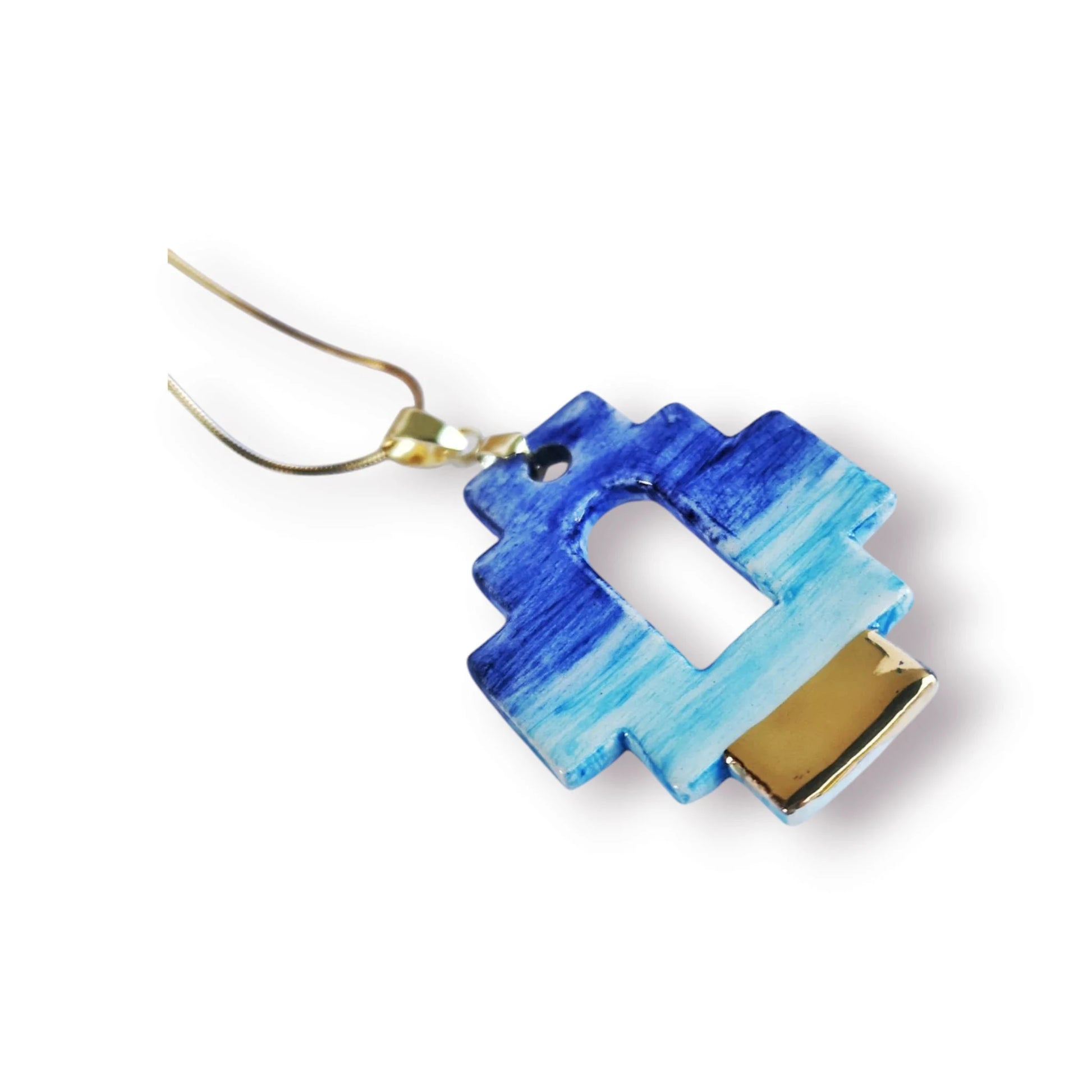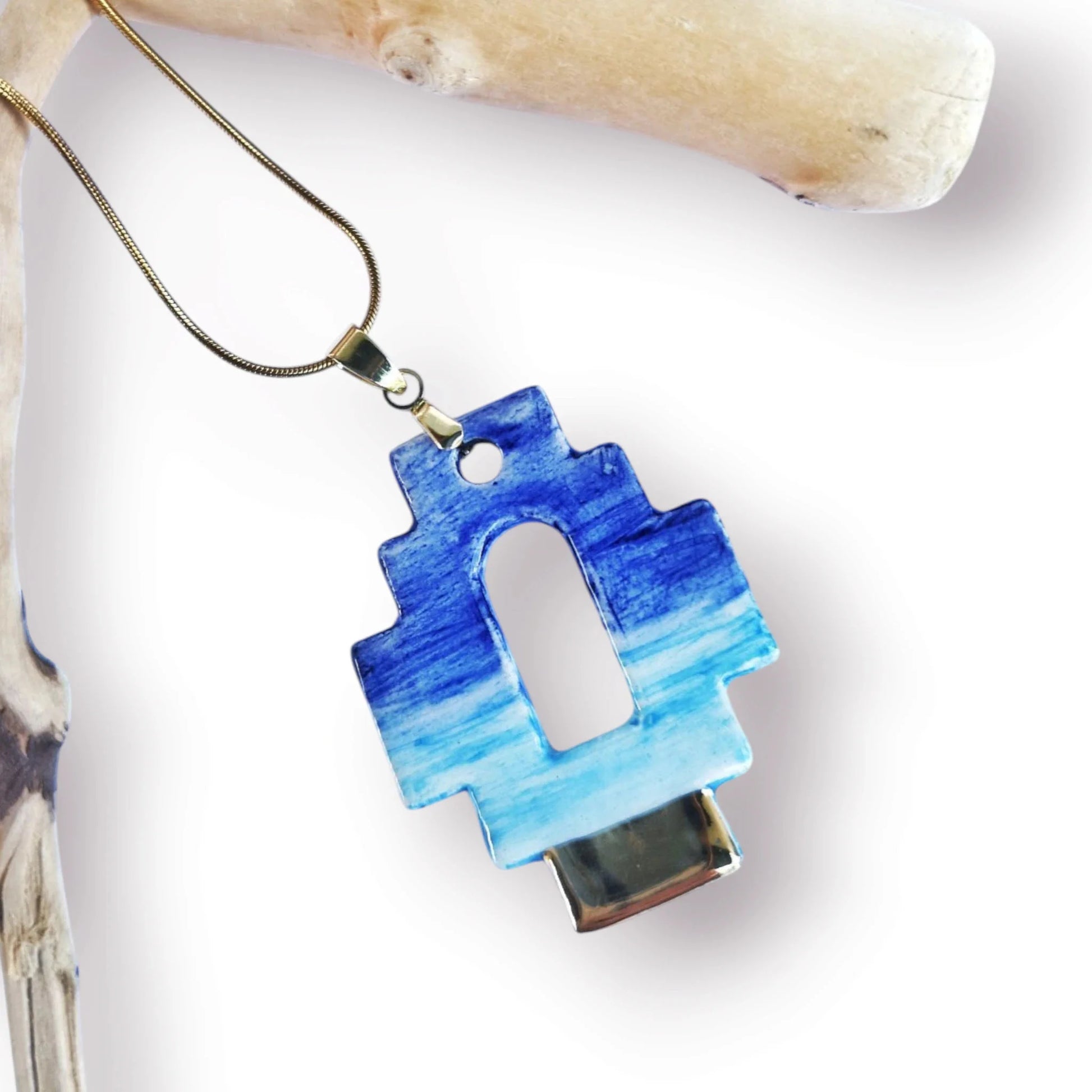 Espectacular colgante de cerámica artesanal que evoca la serenidad del océano con su degradado de azules profundos que se diluye en turquesas cristalinos.
