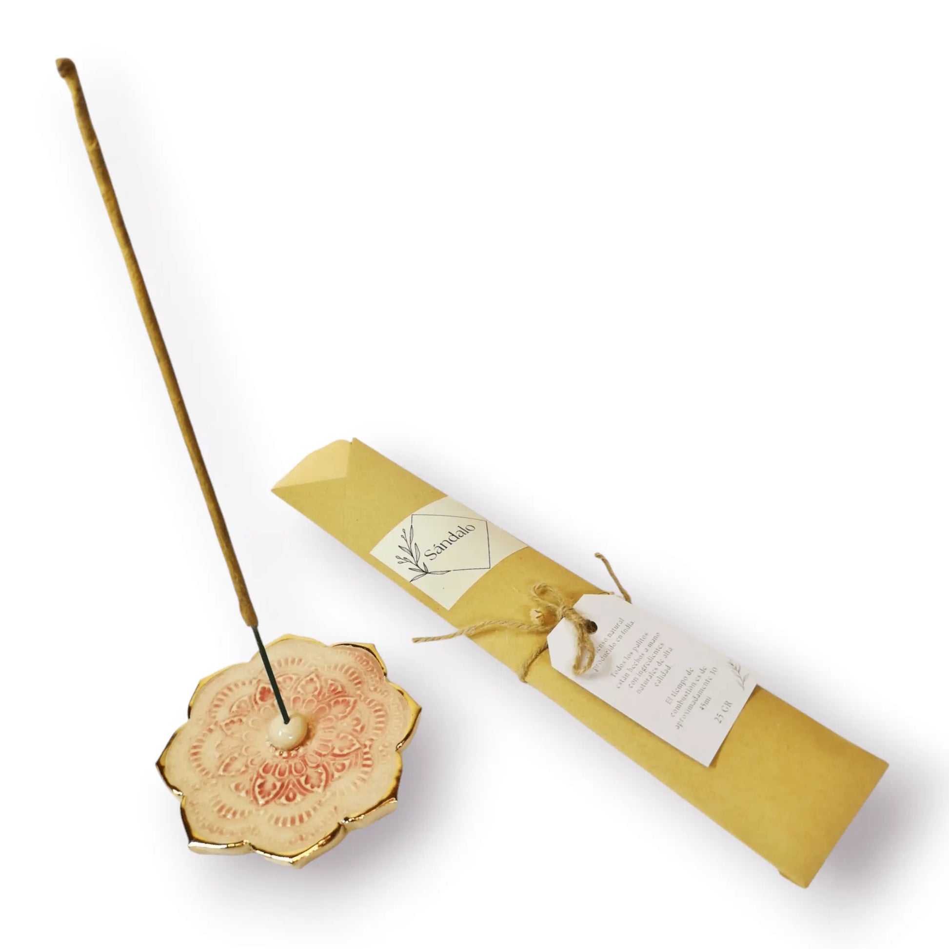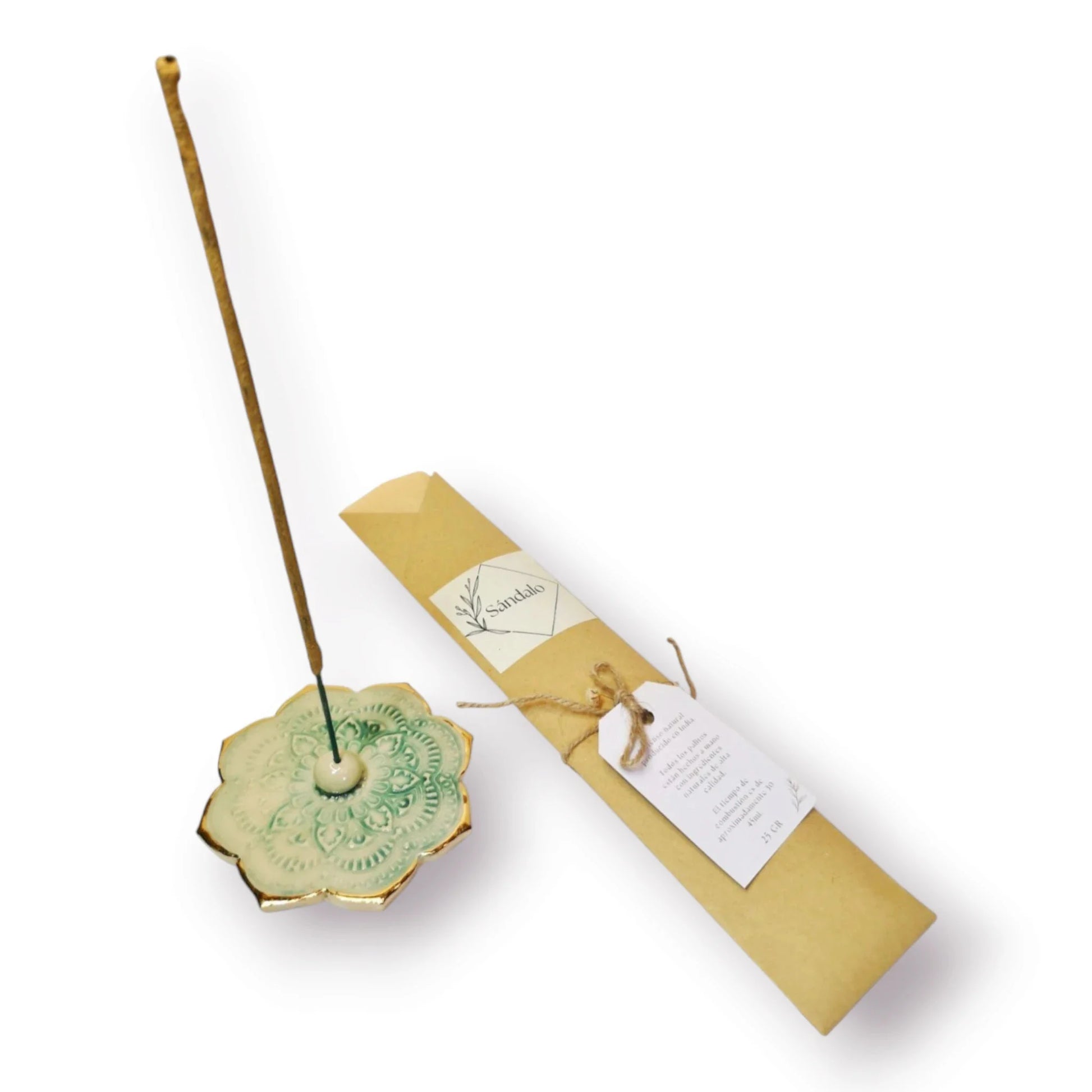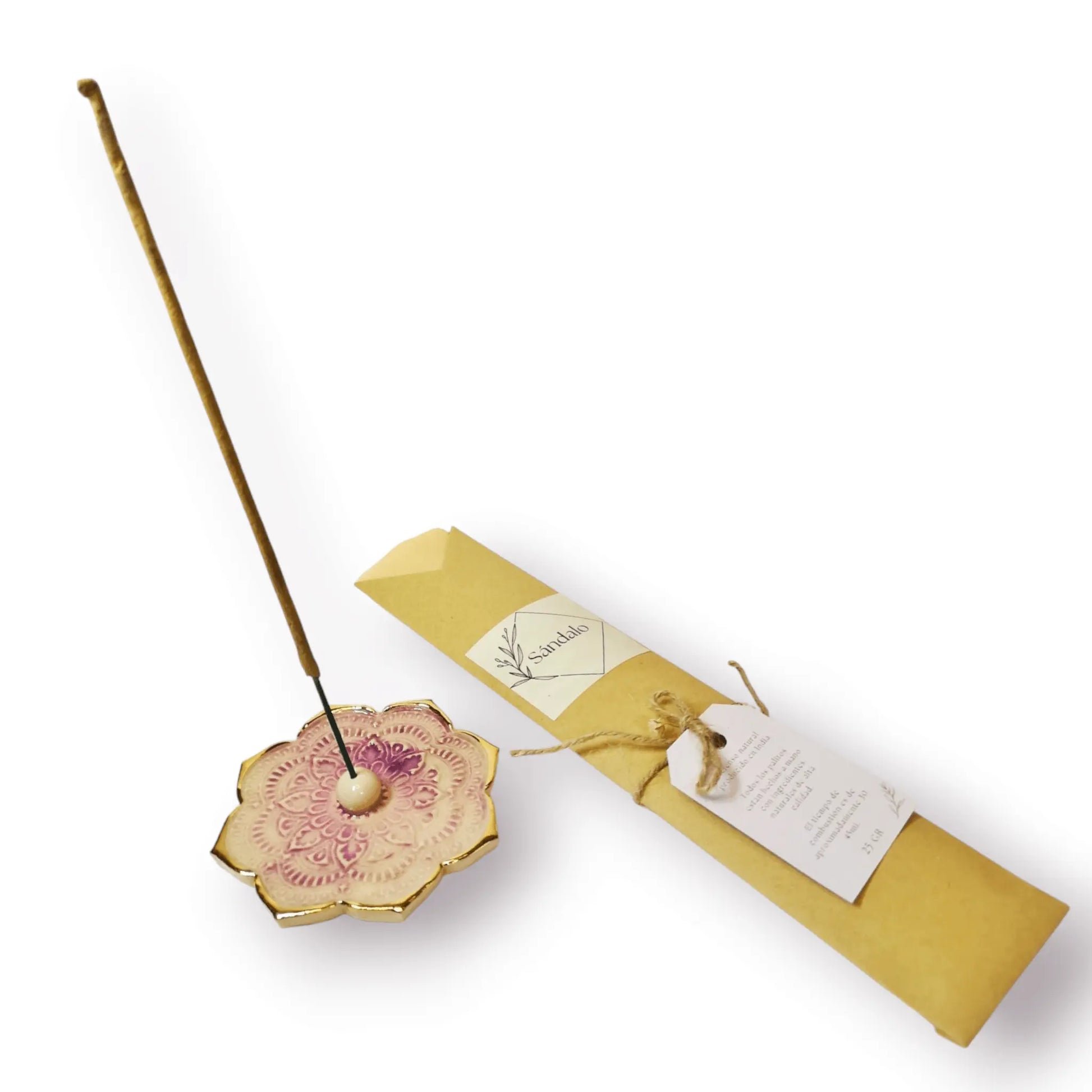 Ideal para varillas de incienso, incluye una base central que sostiene el palito de forma segura. Su forma de flor representa la armonía y expansión del alma, evocando la energía de los mandalas tradicionales.