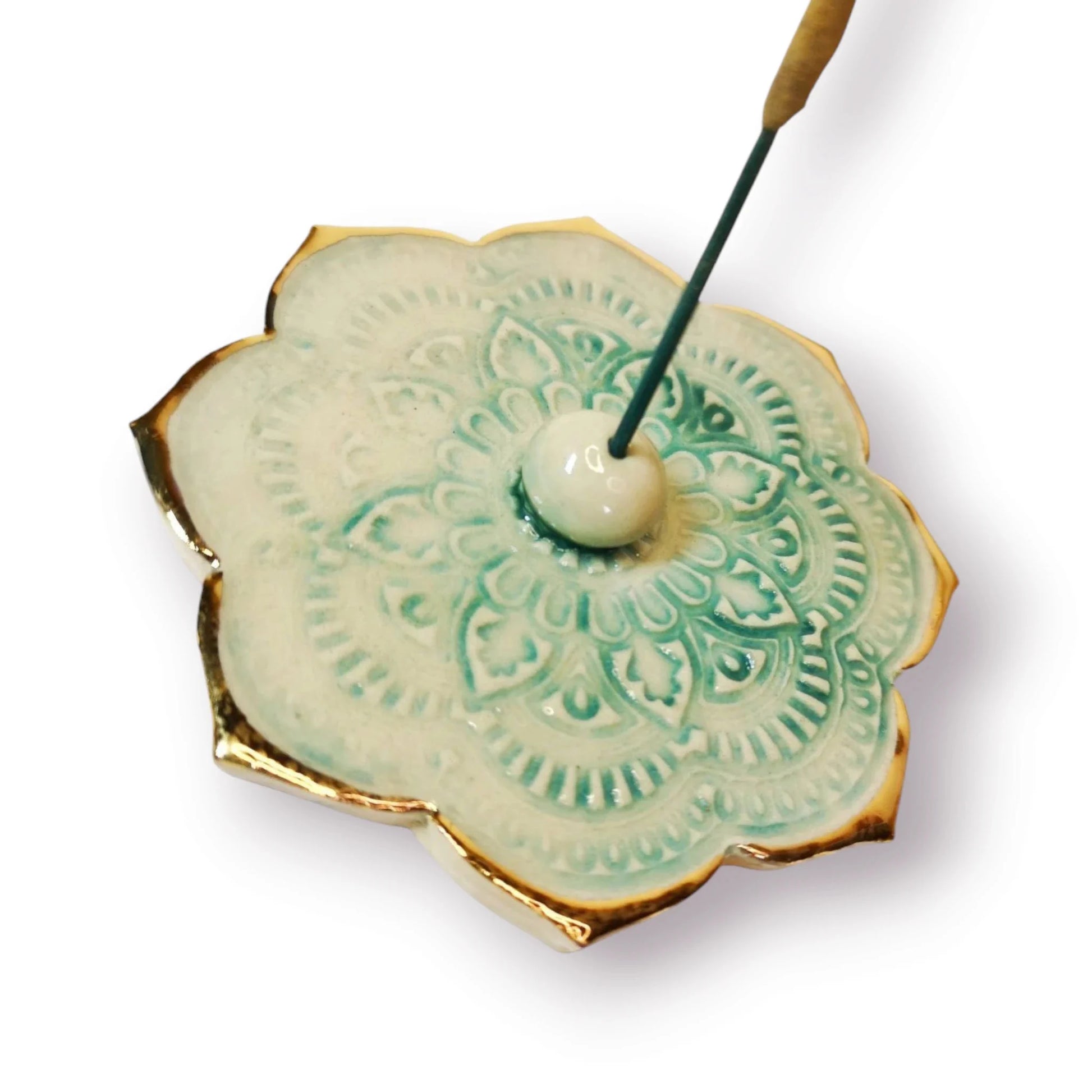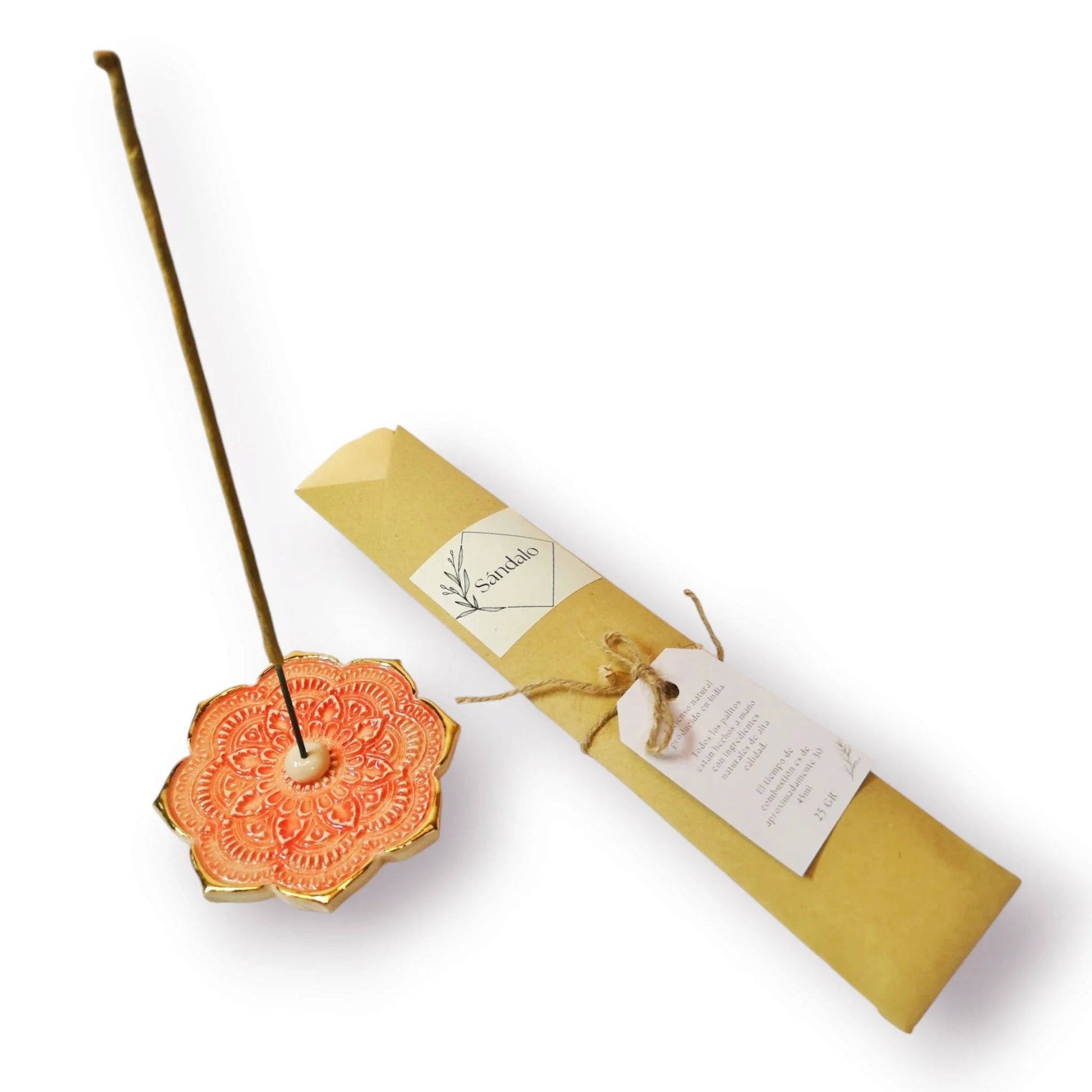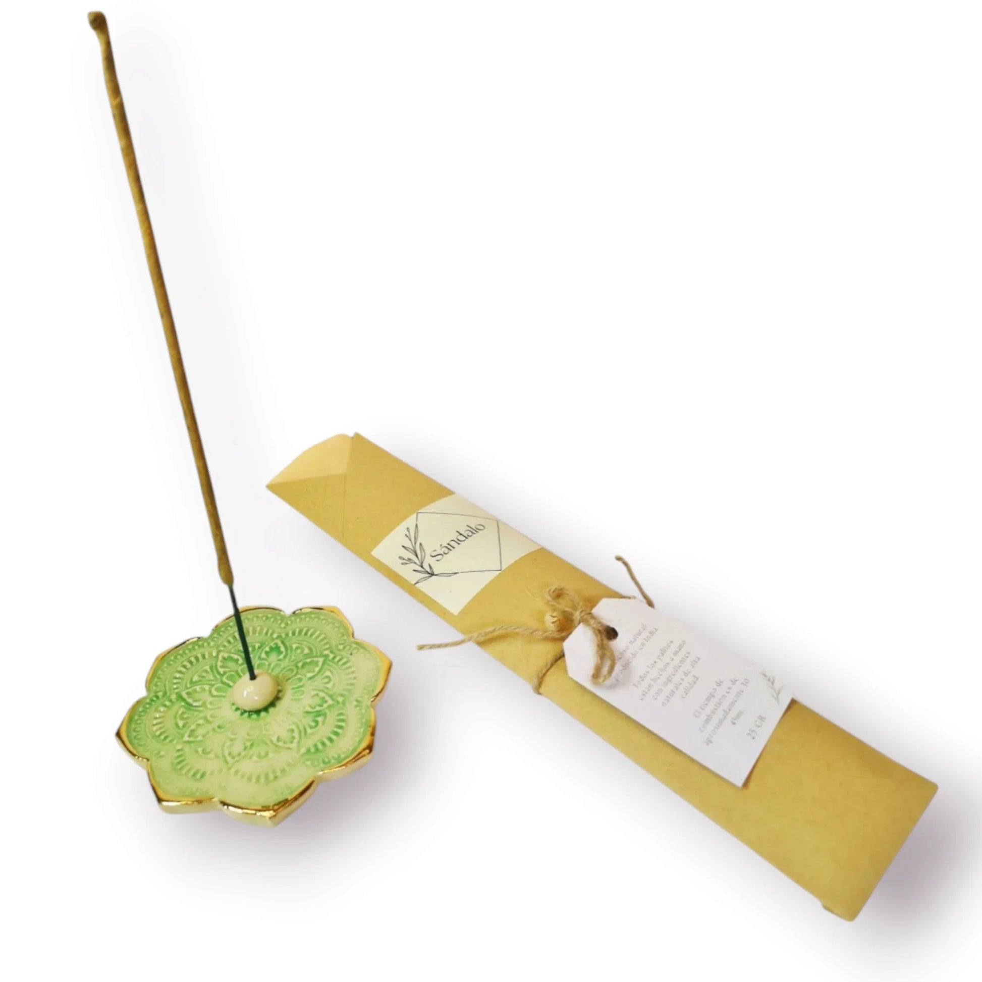 Ideal para varillas de incienso, incluye una base central que sostiene el palito de forma segura. Su forma de flor representa la armonía y expansión del alma, evocando la energía de los mandalas tradicionales.