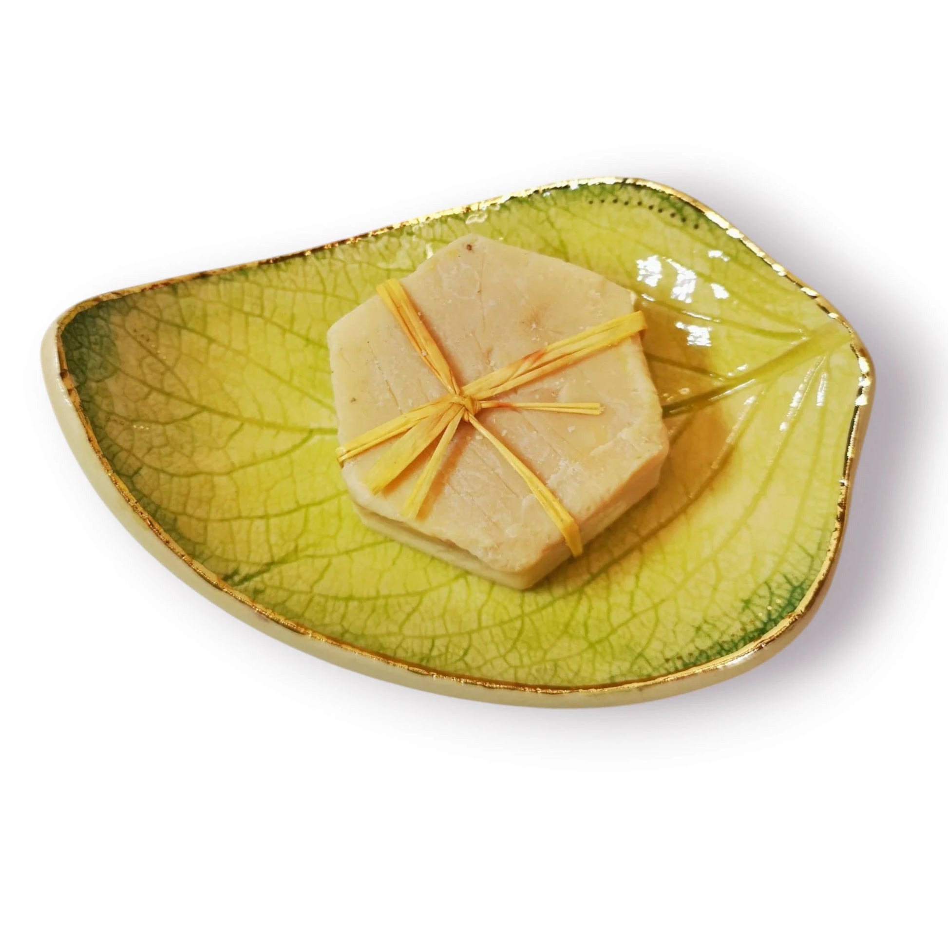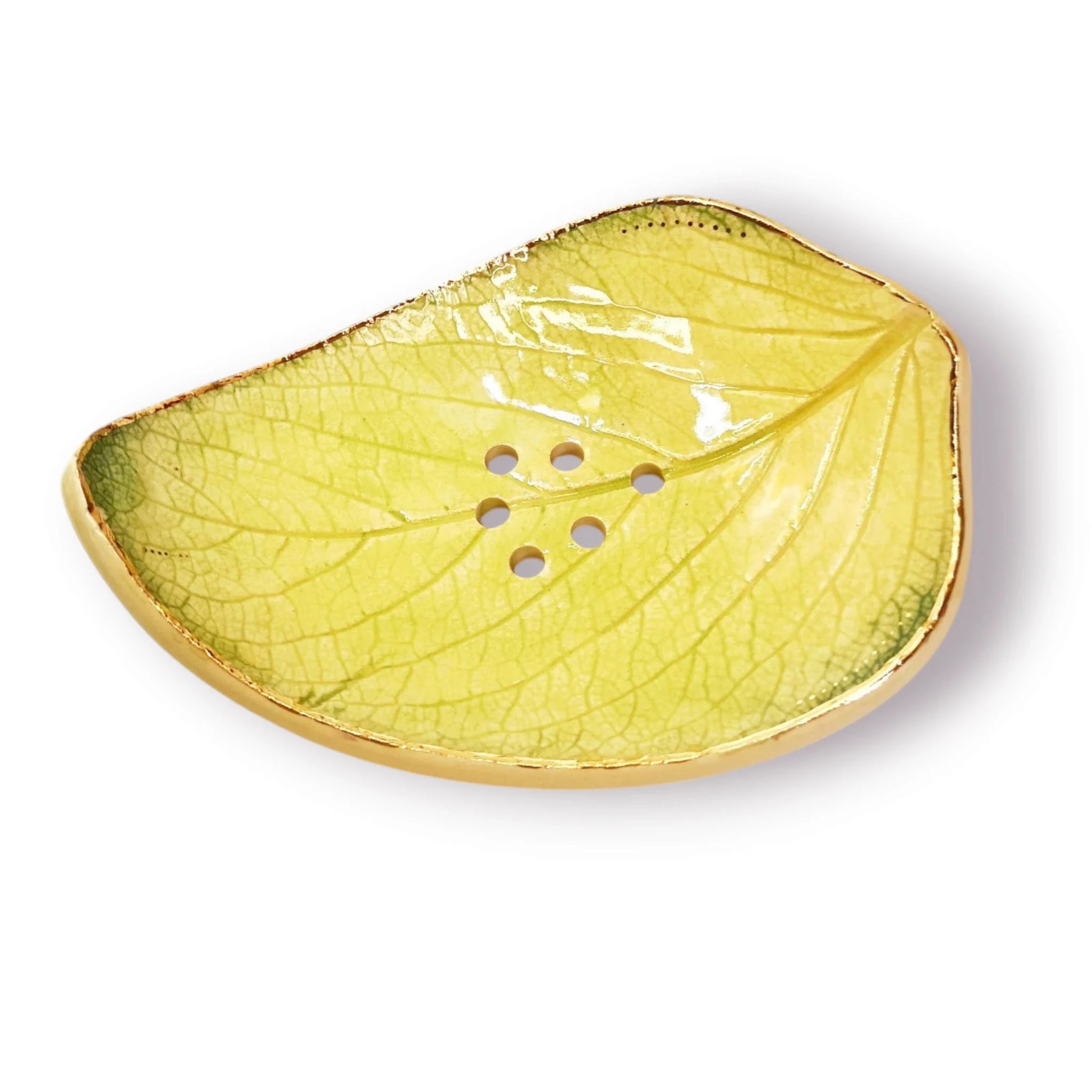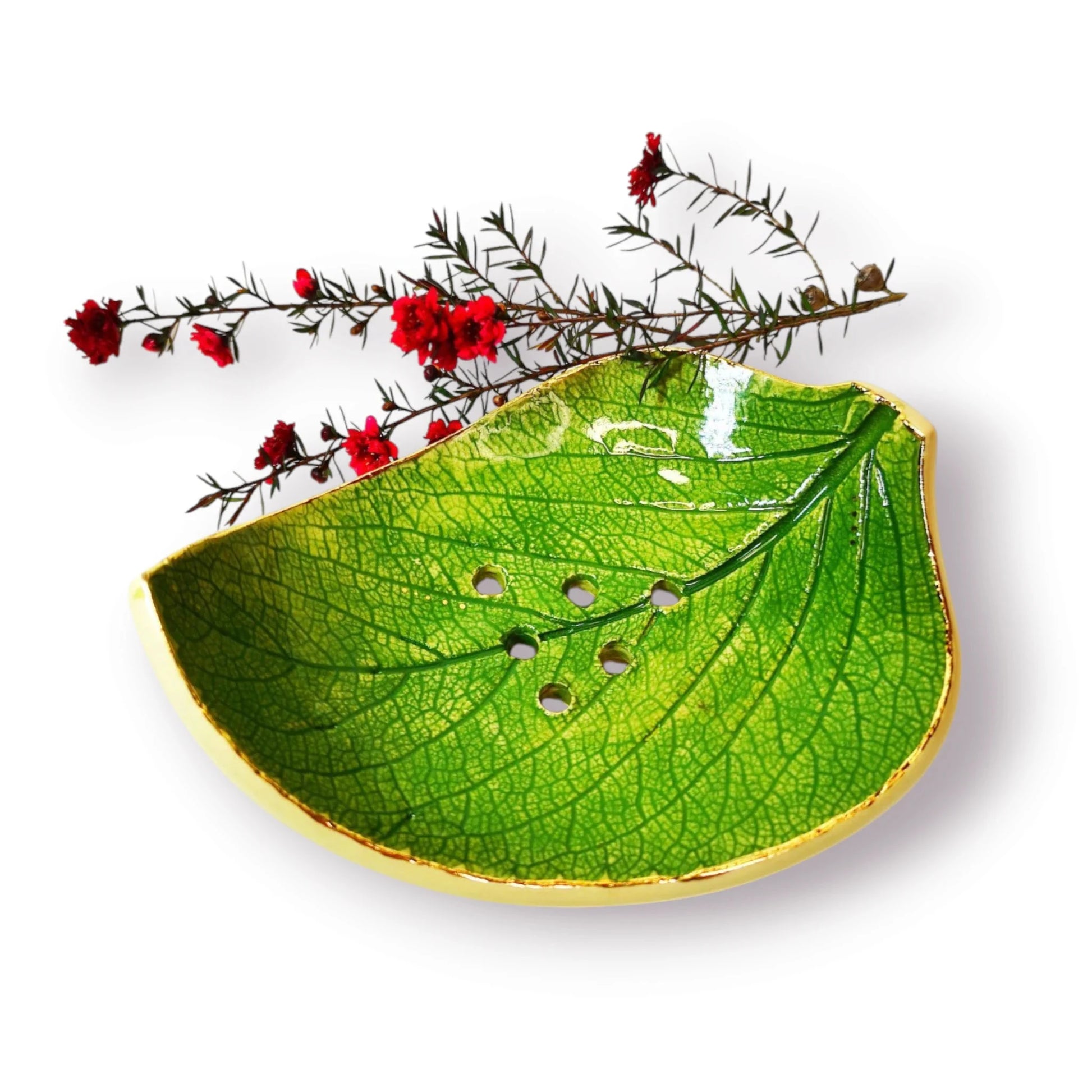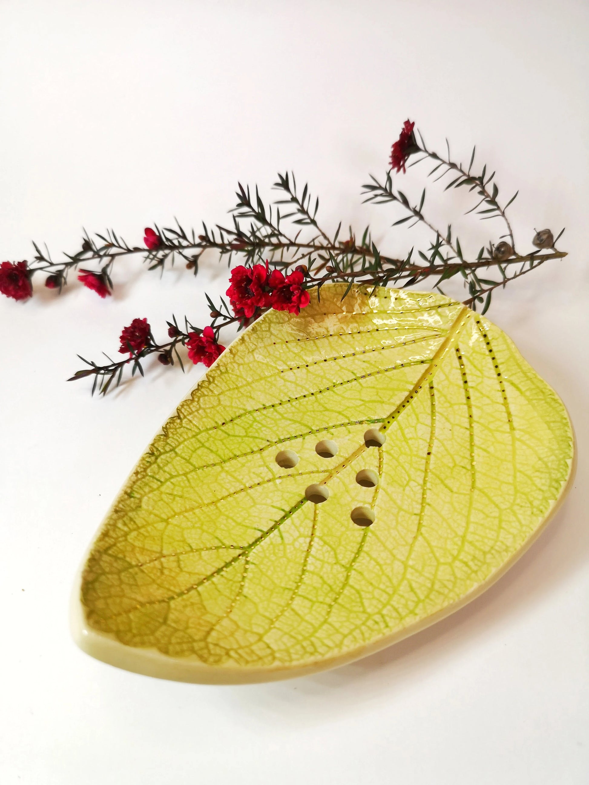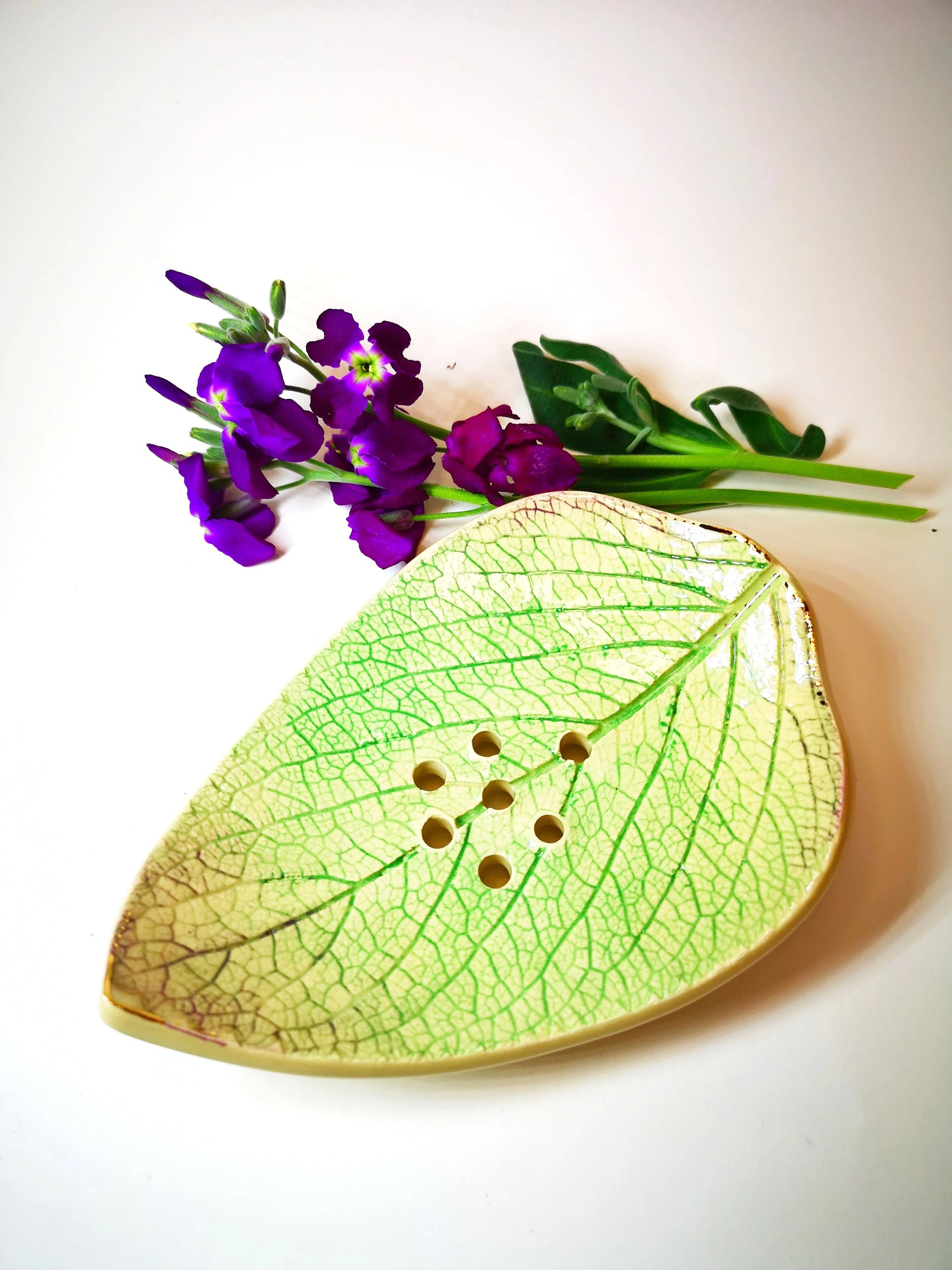 Inspirada en la delicadeza de la naturaleza, esta jabonera de cerámica artesanal en forma de hoja es una pieza única que aporta frescura y elegancia a cualquier espacio.