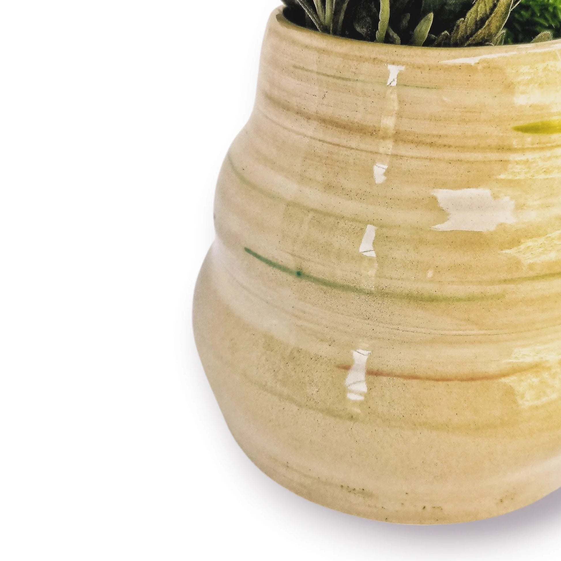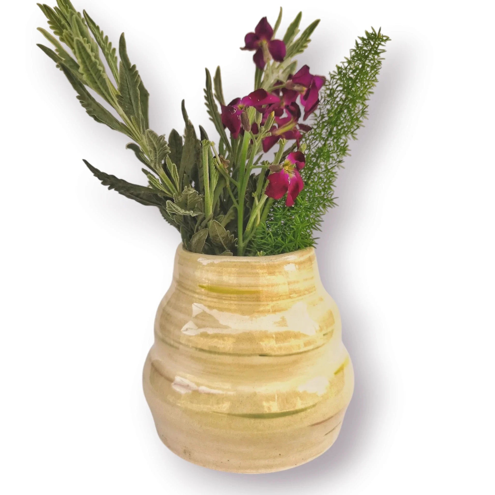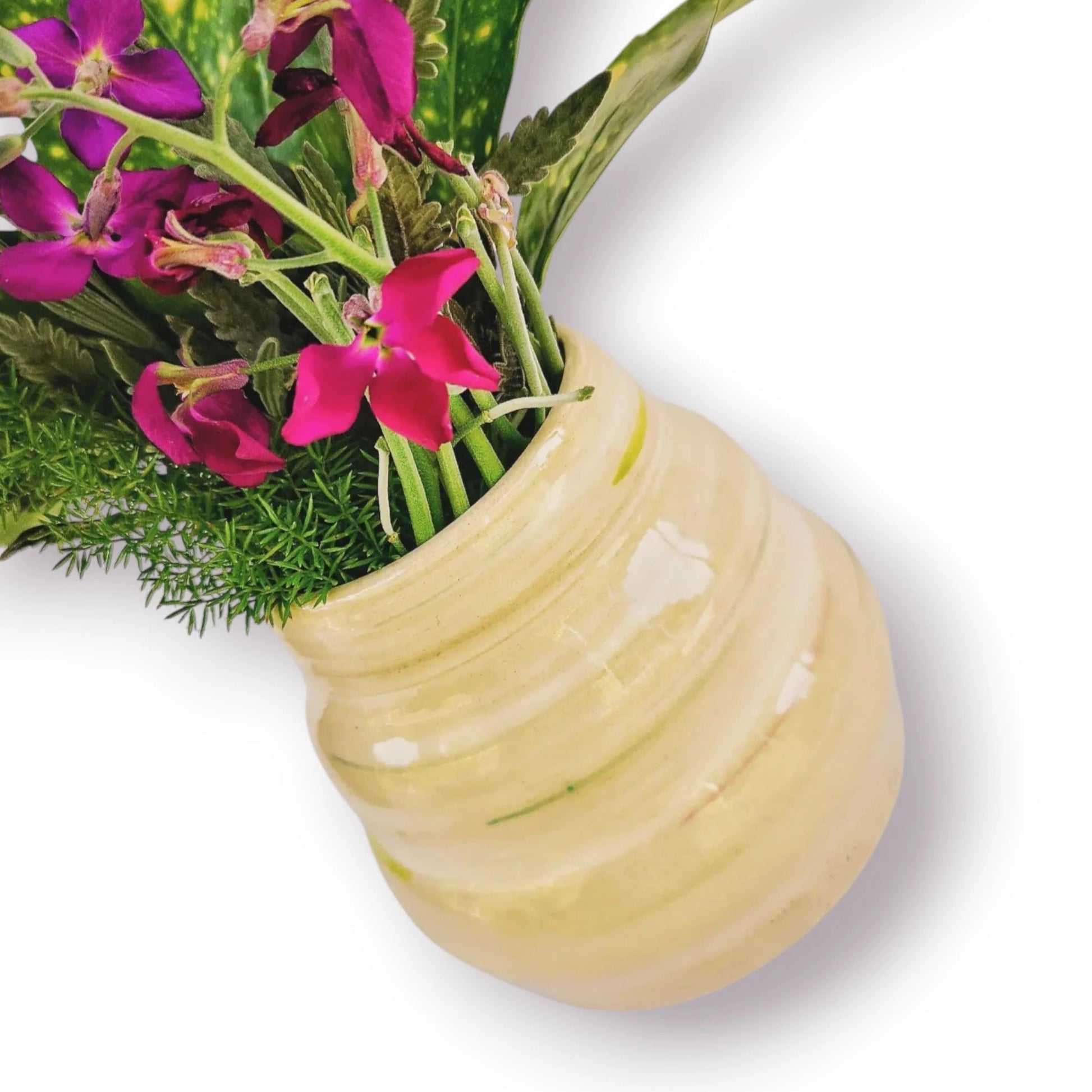 Este jarrón ha sido creado a mano desde la presencia, sin prisas, con arcilla y alma. Su forma orgánica y su acabado en tonos crema y miel aportan calidez, equilibrio y una estética serena a cualquier rincón de tu hogar.