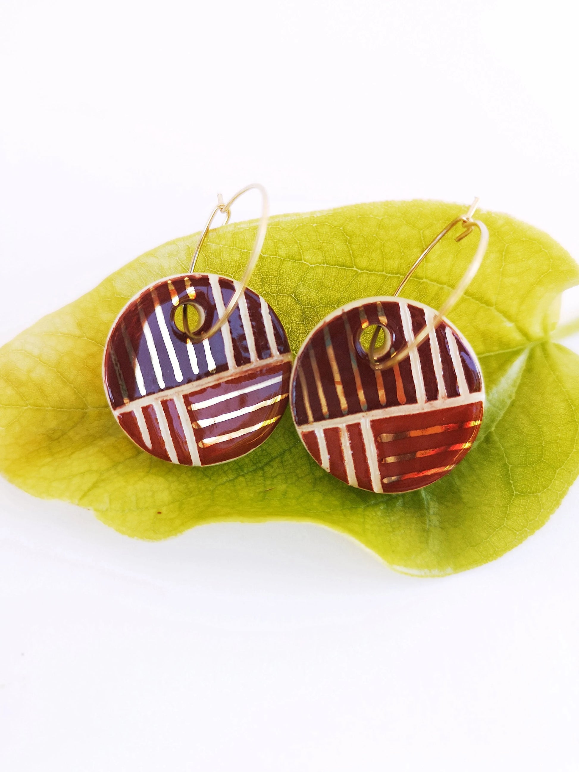 Estos pendientes redondos de cerámica en tonos tierra están decorados con líneas geométricas, esmaltados a mano y con detalles en oro cerámico. Cada trazo refleja intención, calma y elegancia minimalista.