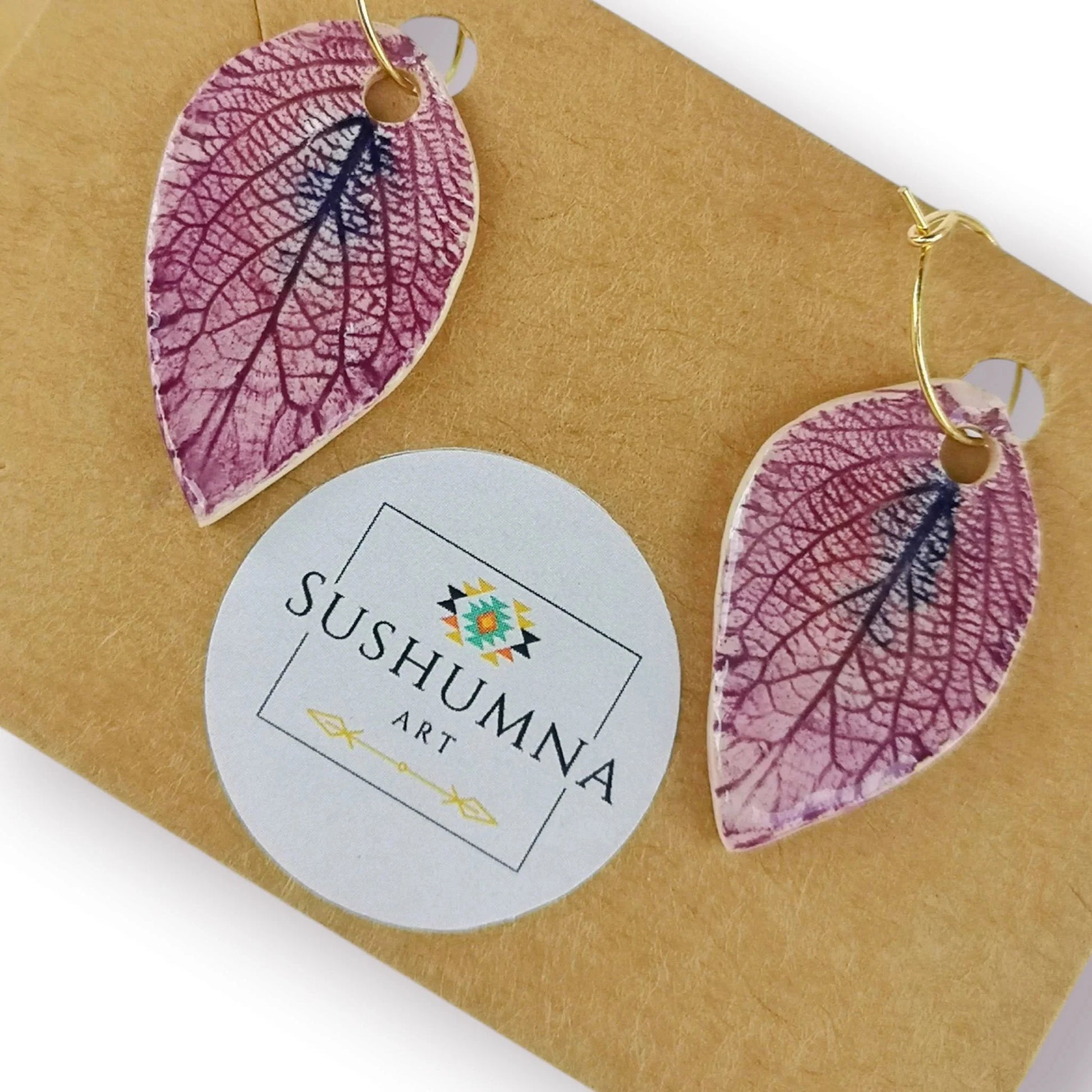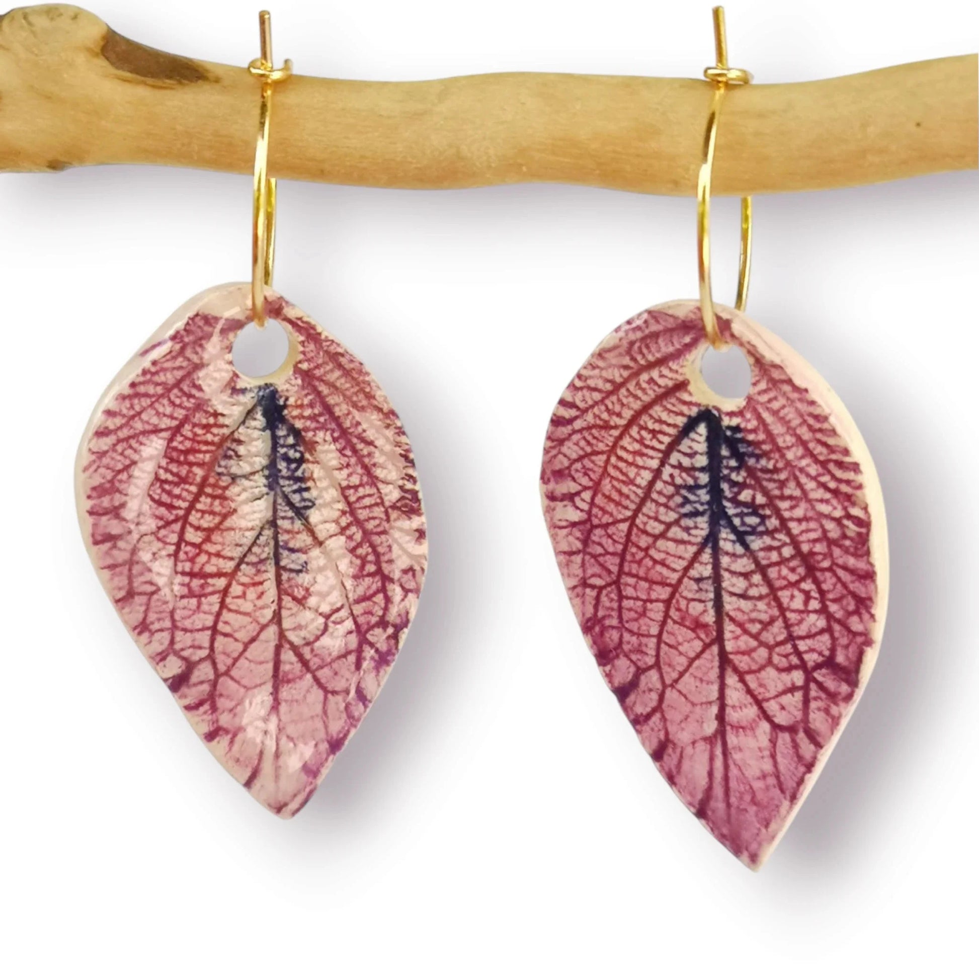 Pendientes de cerámica en forma de hoja con impresión real de nervadura vegetal en tonos rosa púrpura. Fornituras de acero inoxidable dorado.