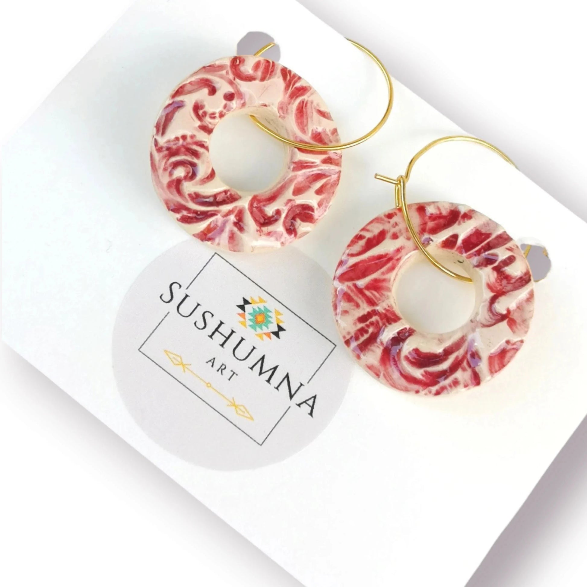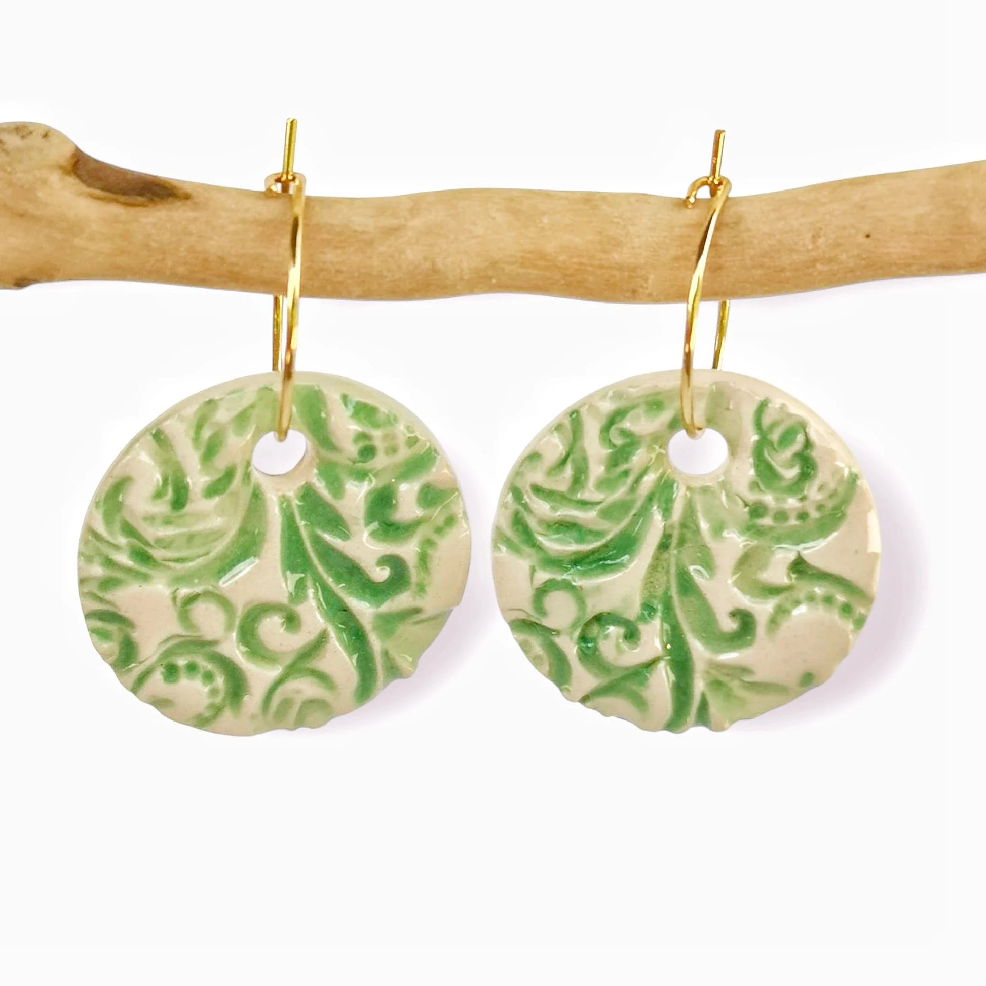 Pendientes de cerámica con relieve, hechos y esmaltados a mano. Fornituras de acero inoxidable dorado .