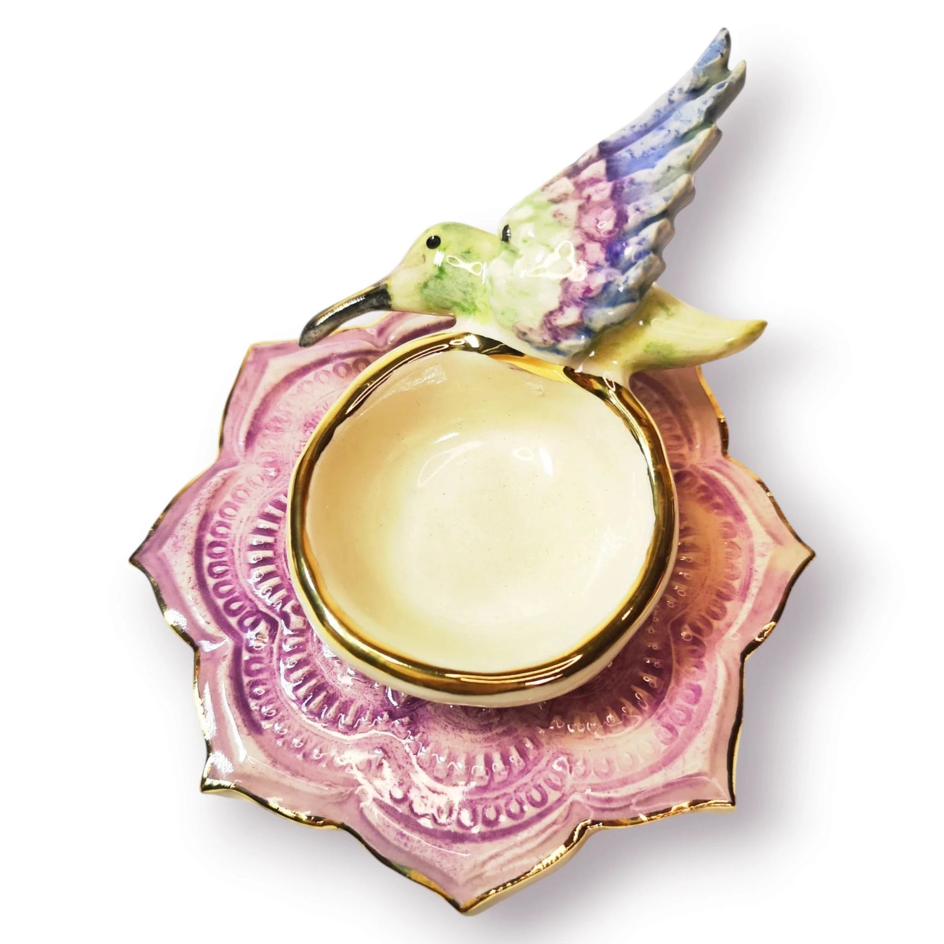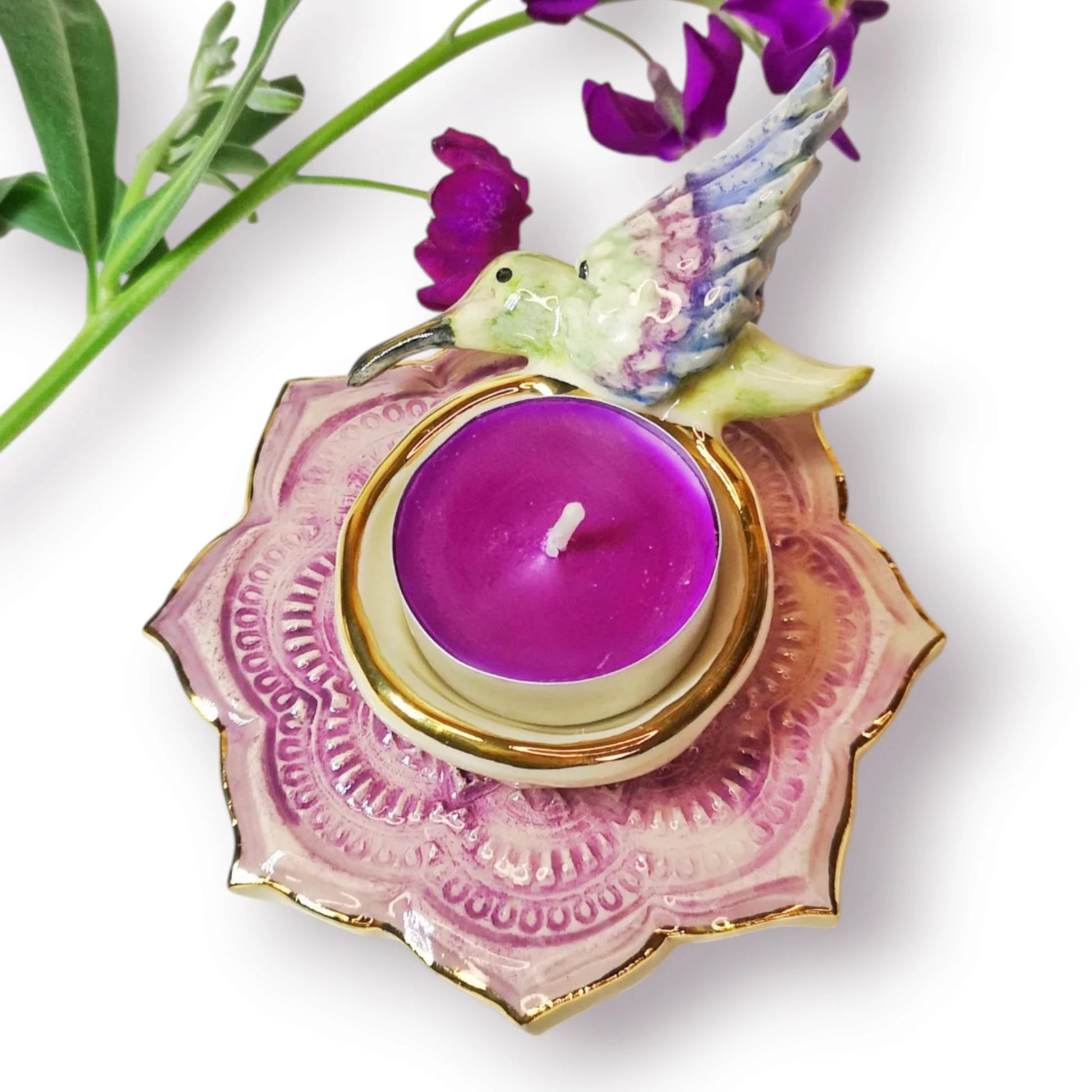 Portavelas de cerámica artesanal decorado y modelado a mano con la forma de un colibrí posado sobre una flor de mandala en tonos malva y lila. Cada detalle ha sido cuidadosamente esmaltado y realzado con toques de oro cerámico en los bordes, aportando una energía luminosa y sagrada.