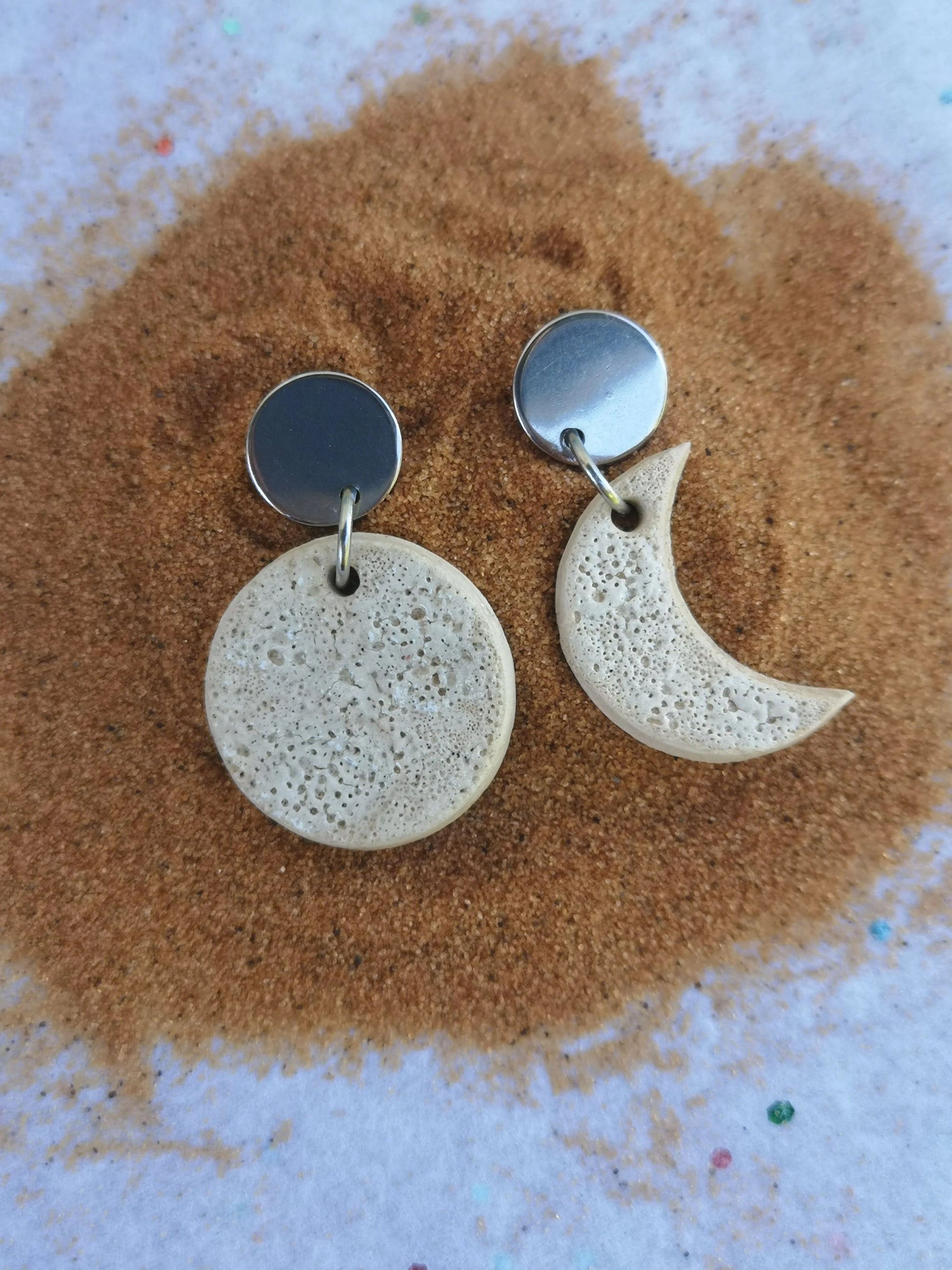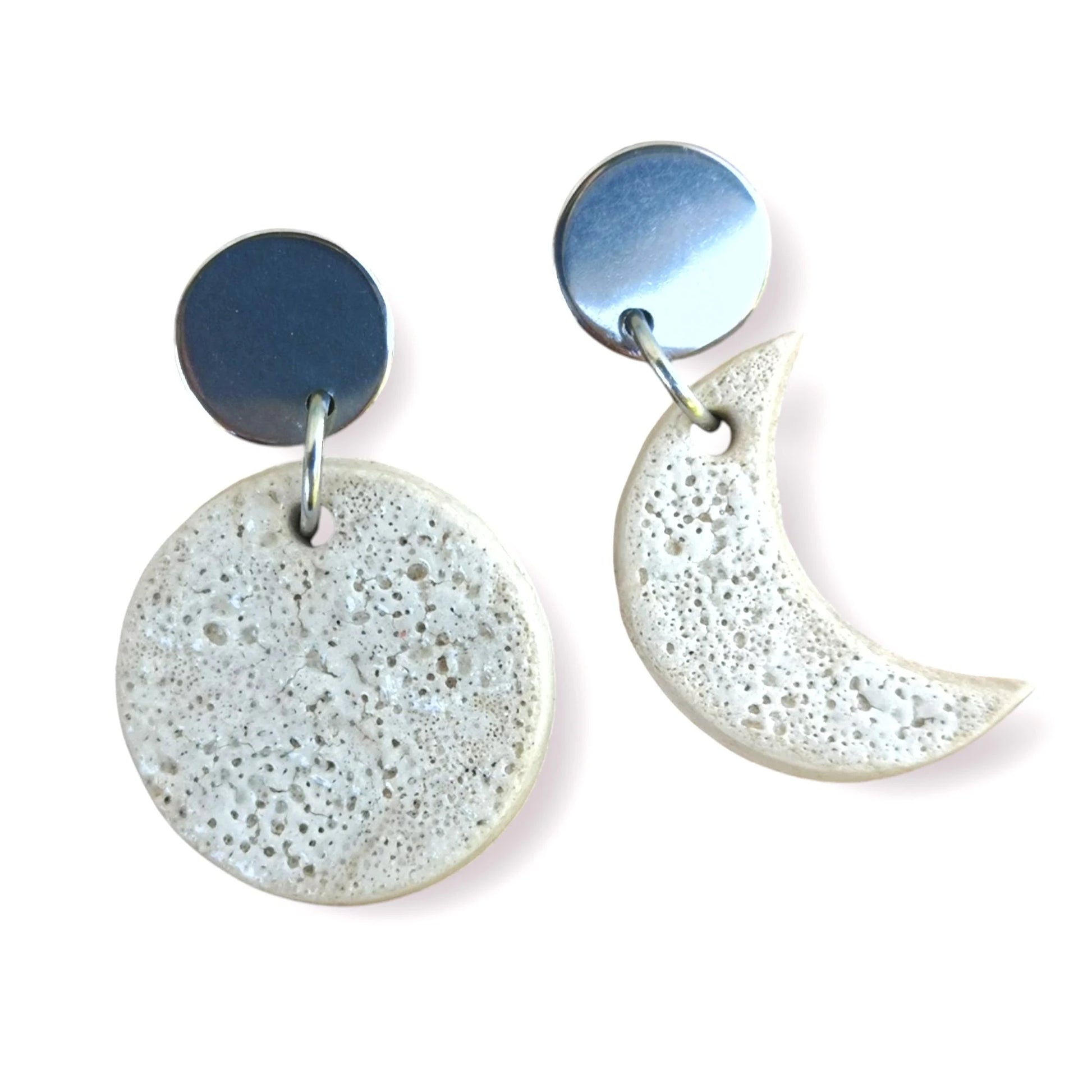 Pendientes luna y círculo en cerámica blanca hechos a mano – Estilo lunar único