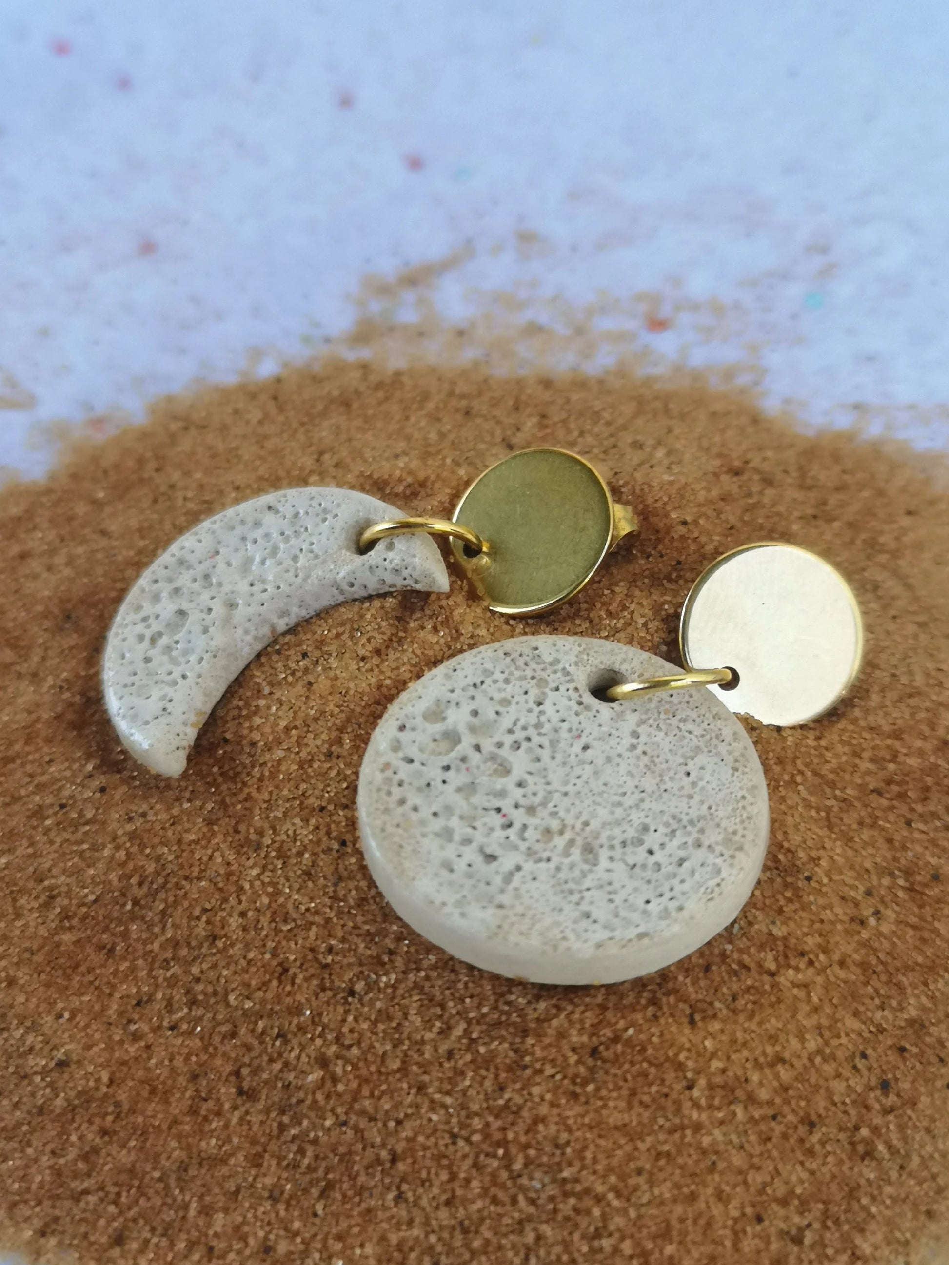 Cada pieza está formada con textura rugosa inspirada en la superficie de la luna, y rematados con aros de latón dorado y plateado que aportan calidez y contraste.